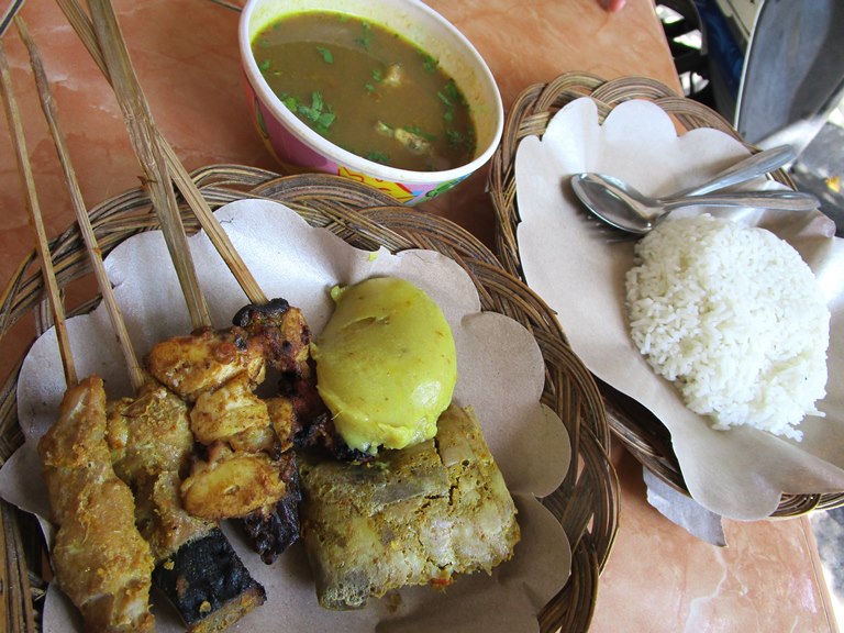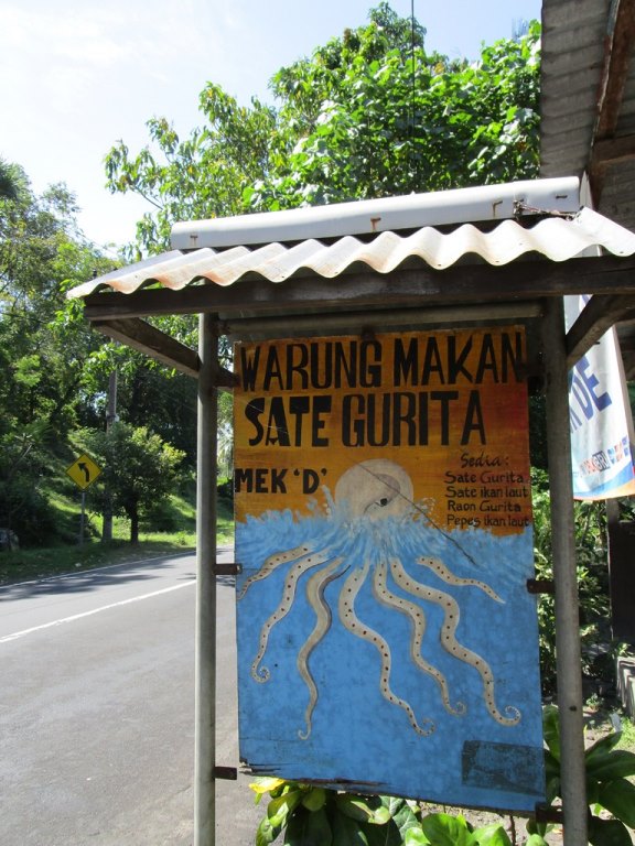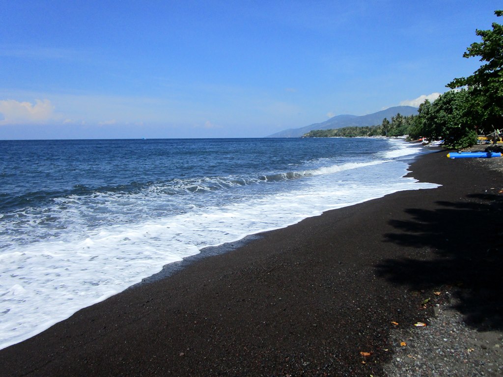 せっかく遥々アメッドまで来たので、隣村のトゥランベンもどんな街か見てみたい、とさらに奥へと足を延ばしてみることに… ダイビングしに来ている人が沢山! そういえば、沈没船のある村だった。 ダイバーたちはビーチから海へ入っていくんだね。 トゥランベンは真っ黒な灼熱の砂浜。青と黒に山が見える、バリ島東部らしい風景が見えた。 街道沿いでお昼ごはん。
