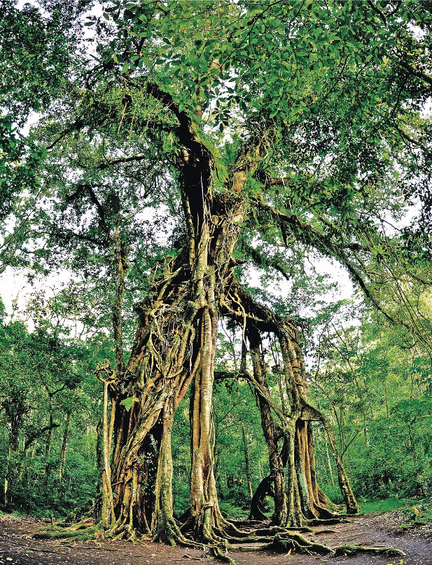 一面の林の中を進むと、バリのパワースポットといわれる●ガジュマルの木に到着。