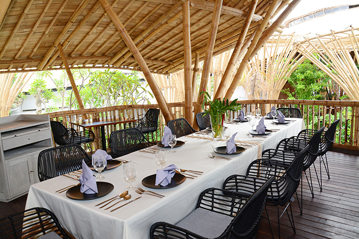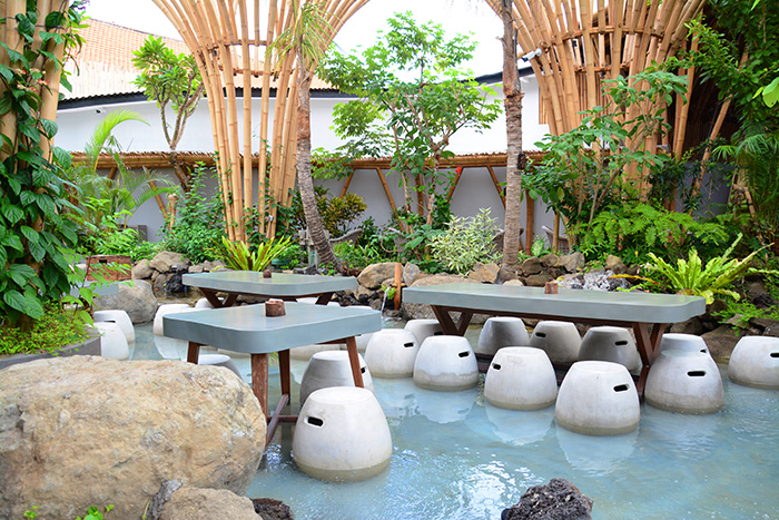 浅い池に足を入れ、涼をとりながら座るテーブル席は常夏のバリならでは。子供たちも喜びそうですね。