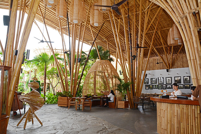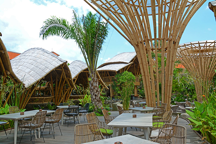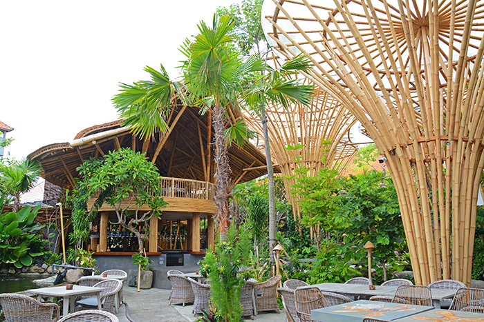 「中は広くて内装にすごくこだわってるよ〜」と友達から聞いてはいたものの、やっぱり中に入ってビックリ!敷地の総面積はは550アール!トゥバンという地区は空港に隣接していることもありごちゃごちゃしている印象なのですが、ここはそんなトゥバンの貴重なオアシス!といった印象です!シンガポールのガーデンズバイザベイを彷彿させるような竹のオブジェ?がニョキニョキ立ってます。笑