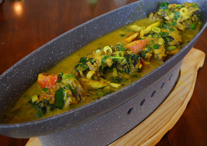 スラウェシ島の郷土料理で大きな魚1匹をいろいろなスパイスや香味野菜で煮込んでいます。器も凝っていますよね〜。見た目よりもあっさりしていてご飯にも合いそう!