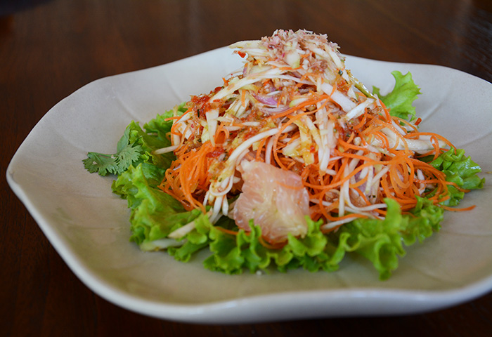 「サラダ ジェルンガ」Rp.48,000。若いマンゴとポメロ(熱帯地方の甘夏)のフルーツサラダ。甘酸っぱいタイソースがたっぷりかかっています。