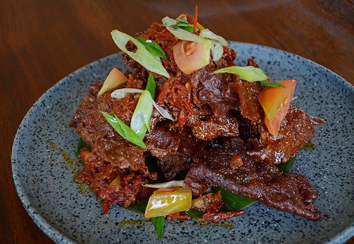 「デンデン ワナク」Rp.98,000。デンデンとは例えるならインドネシア版ビーフジャーキー。薄くスライスして揚げたものにパンチの効いたチリソースが絡まっています。ビールが飲みたくなるぅぅぅぅ。笑