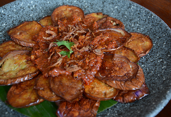 夏野菜の代表であるナスを使ったシンプルな野菜料理「テロン バラド ワナク」Rp.45,000。薄くスライスして焼き揚げたナスの上にバラドソースがかかっています。辛くないので誰でも食べやすそうです。