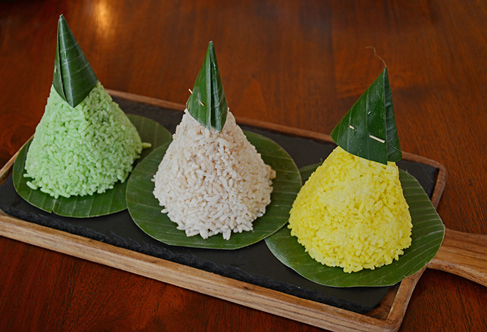 ご飯なんて・・・と思う方もいるかとは思いますが、ぜひ試していただきたいです。ハイナンライスみたいにほんわりと味が付いていて美味しいんですよ〜!右から「ナシクニン」「ナシクチョンブラン」「ナシヒジョー」各Rp,20,000。ナシクニンは黄色いご飯という意味で一番知られていると思いますが、ターメリックライスです。ナシクチョンブランは私も初めて食べたのですが、ボンコットというピンク色の花の咲く香味植物を使ったご飯。癖があるので好き嫌いはあるかとは思いますが、私はハマりました。これが一番好き? ナシヒジョーは、パンダンという葉っぱで緑に染めたご飯。パンダンはお菓子にもよく使われる葉っぱで有名です。