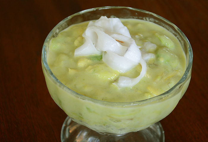 一番おすすめは「エス マラク」Rp.30,000。アボカドのひんやりデザートは、まだ少し原型を残したアボカドにジャックフルーツやコンデンスミルク、ココナッツミルクを混ぜています。上にトッピングされているのはココナッツの果肉です。