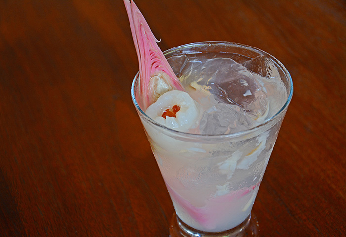 こちらはジュース「ボンコット ブロッサム」Rp.45,000。ボンコットは先ほどご飯の時にもお話しした香味植物。その花を使ったジュースです。ライチやレモン果汁なども加わり、さっぱりとしてて美味しいです。