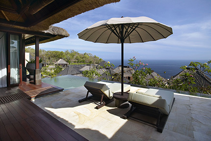 周囲のヴィラの藁葺き屋根が美しいフレームのようになりその先に蒼い海の眺めとなります。