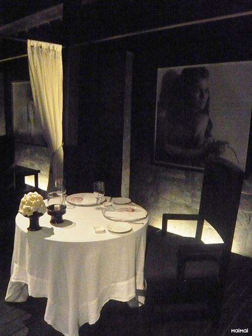 真っ黒なレストランに真っ白なテーブルクロスと美しいカーテン。