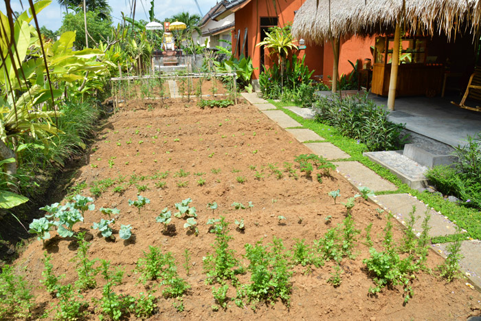 ↓ガゼボの裏にはプチ農園。ブロッコリーや人参、セロリかな?が植えられていました。収穫までにはまだまだ時間がかかる感じ(笑)。