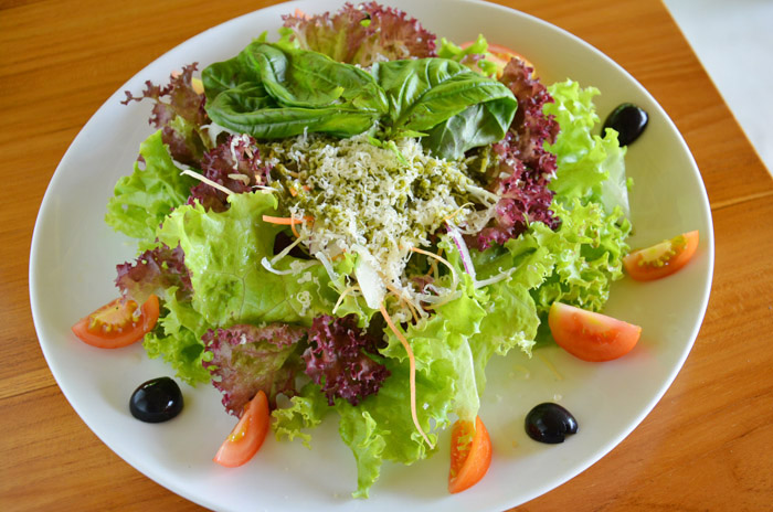 ↓ティティサラダ Rp.38,000。バリの高原地帯ブドゥグルから仕入れたオーガニック野菜だそうです。ドレッシングもオリジナルで、さっぱりバジル味でした。