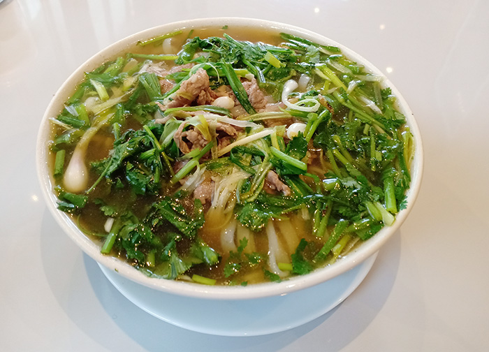 真ん中には柔らかい牛肉、シャキシャキのネギとパクチーがたっぷり乗って麺がほとんど見えないほど!