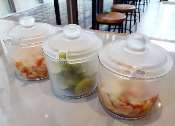 スープに入れて、好みの味に調節できるライムやニンニク唐辛子酢が出てきました。