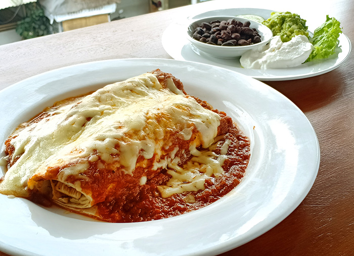 ホームメイドのトルティーヤに鶏肉やチェダーチーズ、モツァレラチーズをたっぷりと巻き込み、特製唐辛子ソースとチーズで焼いたエンチラーダ。お好みで添えの黒豆やワカモレ、サワークリームを足してさっぱりとした味わいに。