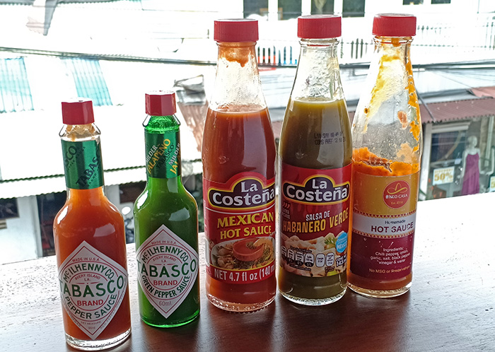 辛さが足りない人にはチリソースもいっぱい用意されています。一番右はタコカサのオリジナルです。私は右から2番目のハバネロサルサソースがお気に入り。ハバネロってすごく辛いイメージで最初は恐る恐るでしたが、それほど辛くありませんでしたよ〜。家に常備しておきたいソースかも。笑