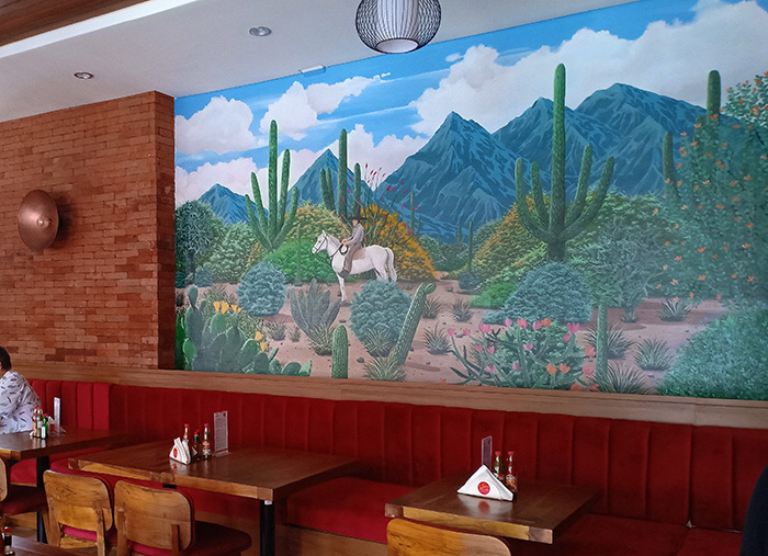 メキシコを象徴するサボテンが描かれた壁画が目を引きます。