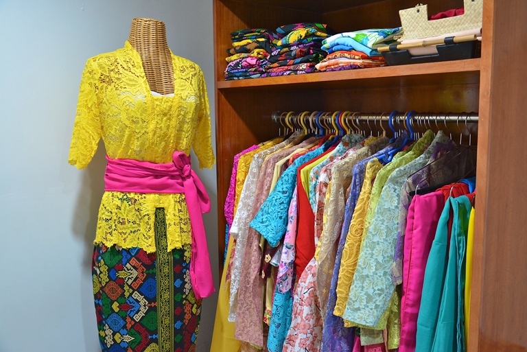 色とりどりのクバヤと更紗からお好きなものを選びましょう。その土地の衣装を身に着けるのはいい思い出になりますね。ちなみに店頭にはめちゃ背の高い昭和モードなマネキンが正装衣装で立っております。(スタッフは一生懸命素敵なマネキンを探す旅 in バリに出ておりましたよ。(笑))