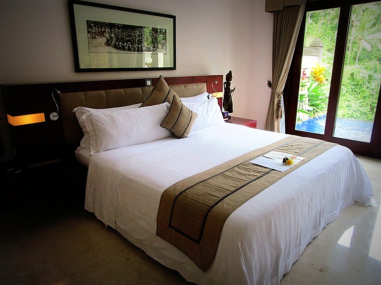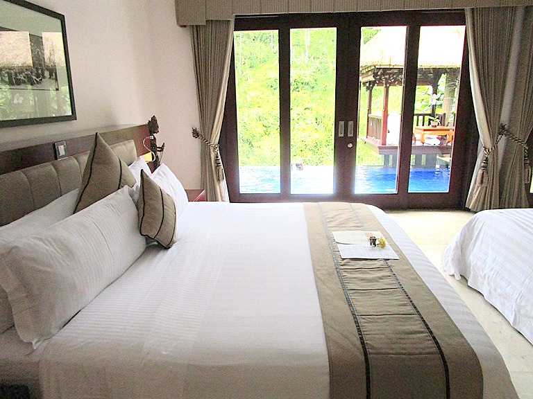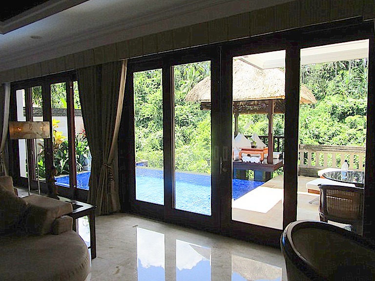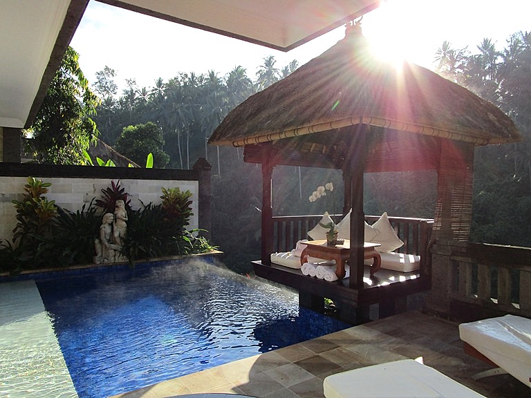 視界を遮るものがなく、前のヴィラの屋根、もありません。朝はこの渓谷からの水の音で目を覚ますのです。そして谷からの朝靄とヤシの木々の間から昇る太陽の光がこぼれ、プールの水面は輝いている…