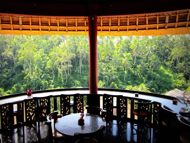 王家の谷と呼ばれるウブドのプタヌ渓谷を一望する、緑に包まれた三角屋根が印象的なカスケードレストラン。