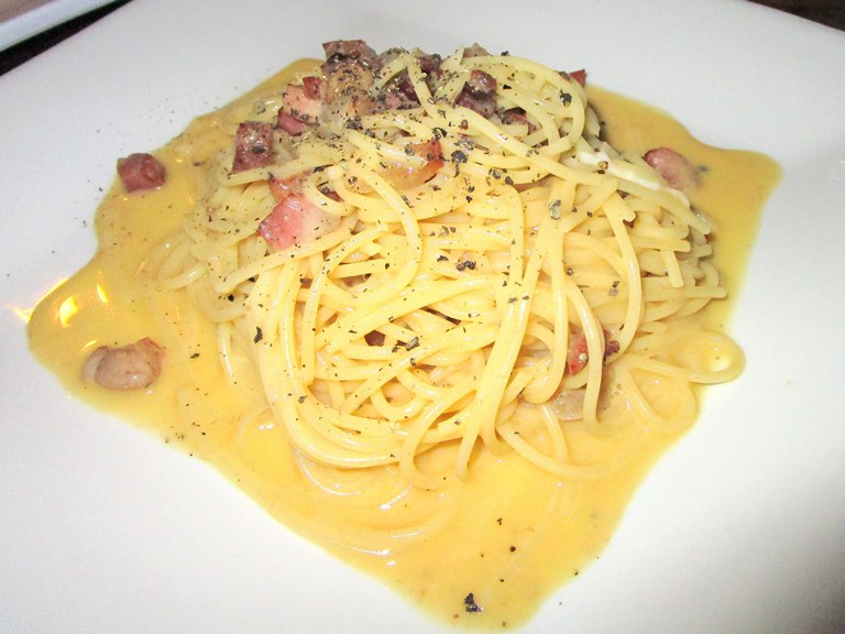 カルボナーラ Rp 36,000。普通のベーコンではなく厚切り肉を細かくした感じが珍しい。麺細目も好きです。