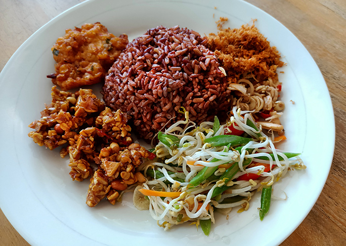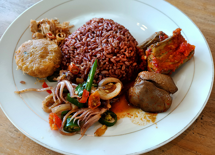 ご飯は白飯、赤米、ナシクニン(ターメリックとココナッツで炊いた黄色いご飯)の3種類から選べます。