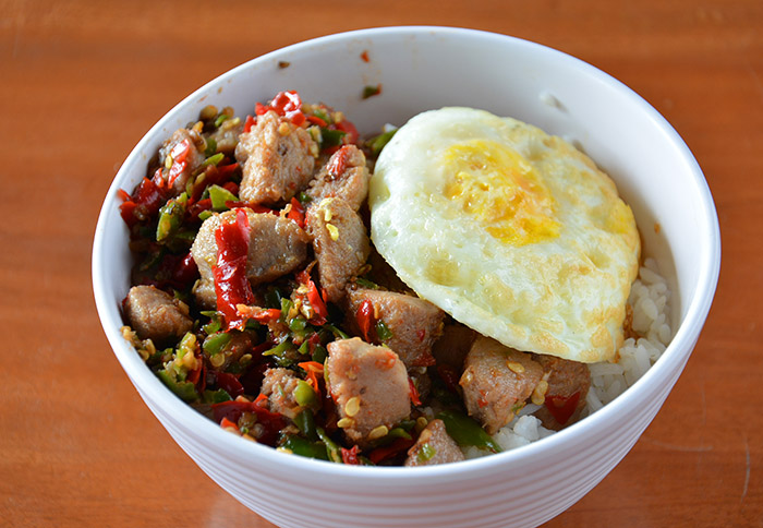 ↓「ナシ バッソサンバルコンスレッ+トゥロール」Rp.24,500。唐辛子がたっぷり混ざったこの丼もの、辛いものが平気な私でも途中でK.O.笑。