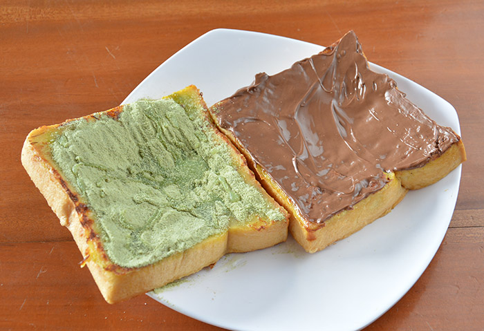 ↓「ロティ ハーフハーフ」Rp.19,500。ヌテラ(イタリア発、ヘーゼルナッツペーストをベースにしたチョコレート風味の甘いスプレッド)と練乳に粉末グリーンティーをたっぷりかけたトーストが2枚。両方とも美味しいですが、グリーンティーは息を止めて食べないと粉が舞い散る羽目になるので気をつけましょう。