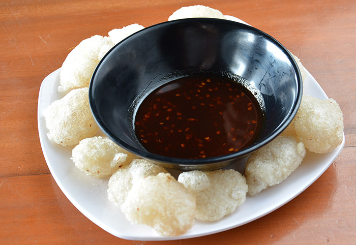 ↓ジャワ島バンドゥンの揚げ菓子「チレンパンダワ with スペシャルソースプダスマニス」Rp.28,500。中がふわふわの不思議な食感。甘辛ソースをつけて食べます。