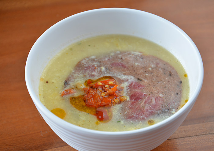 ↓「インドミー ソトサミン with ダギン カンビン ムダ」Rp.26,000。アラブの油?を使ったスープに若い山羊の肉をトッピング。ライムを絞ると肉のクセが和らいで、さっぱりと頂けます。