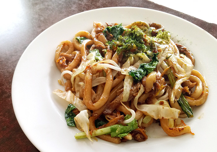 辛焼うどん シーフード Rp.38,000。焼きうどんは、メニューをよく見たら2つありました。辛い方はソースベースです。個人的には醤油ベースが好きですが、これはこれで堪能できます。辛い印の唐辛子マークが入っていますが、そんなに辛くなかったかも。