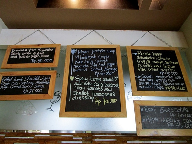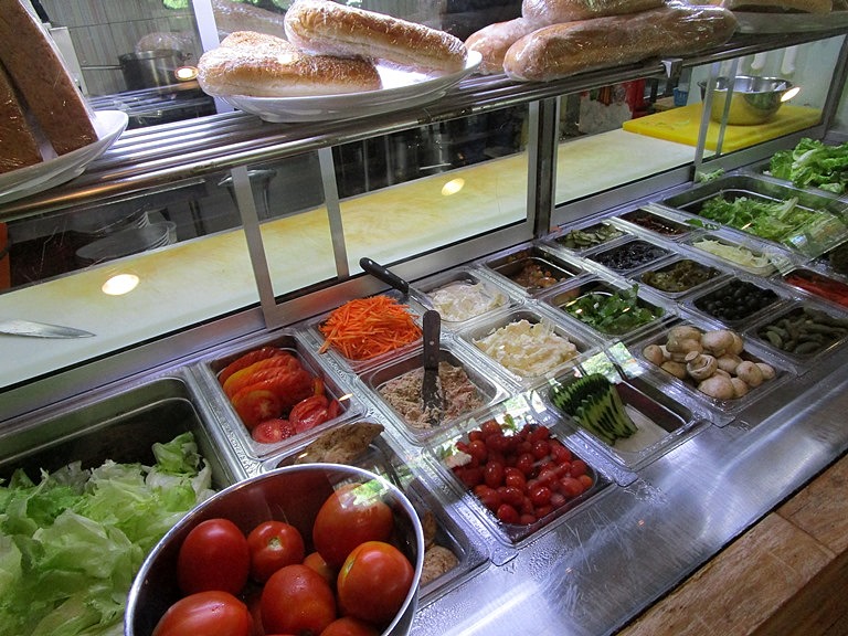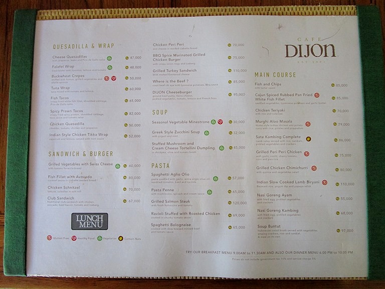 サンドイッチ、バーガー、パスタ、スープ等から魚、チキン、ビーフ等メインコース、ナシゴレン、サテ、スープブントゥット(オックステールスープ)等のインドネシア料理、ディナーはしっかりメニュー、日替わりメニューもあるので黒板をチェック。飽きないバラエティ豊富なメニューですが、ディジョンはサラダやサンドイッチをカスタマイズで作ってくれるのが特徴です。お好みのパンと具、を選んでドレッシングやマヨネーズマスタードもたくさんかけてもらいましょう。私はだいたいパンをホワイトブレッドにしてメインはローストビーフ、アルファルファ、トマトやレタスなどの野菜をてんこ盛りで頼みます。