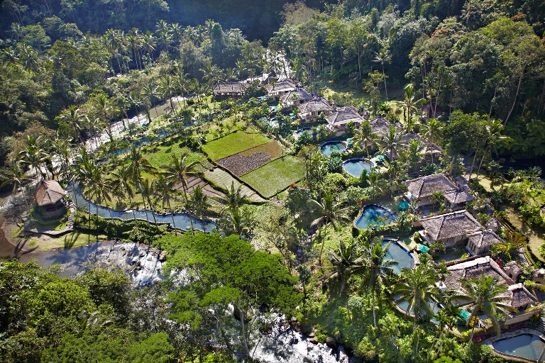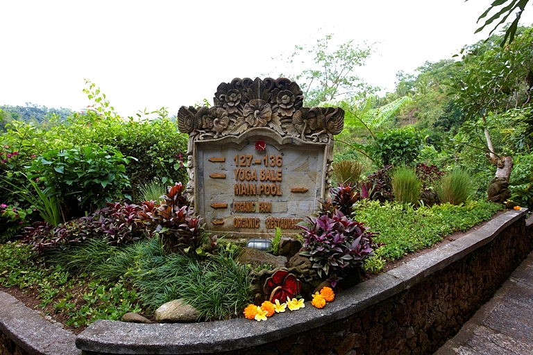 その横を流れるようなアユン川沿いにつくられたラグーンプール、アユン川とラグーンプールに挟まれたヨガのパビリオン、川沿いのアユンオーガニックレストラン、オーガニックの野菜畑も見えます。そういえばここでピーマンが見えました。