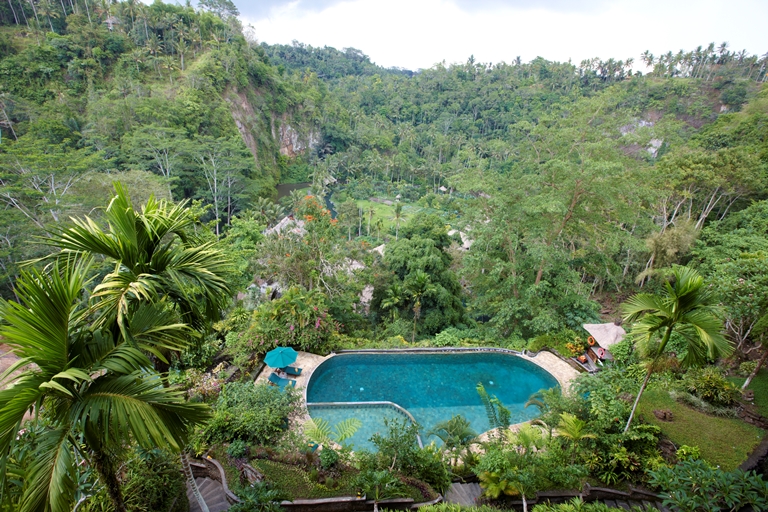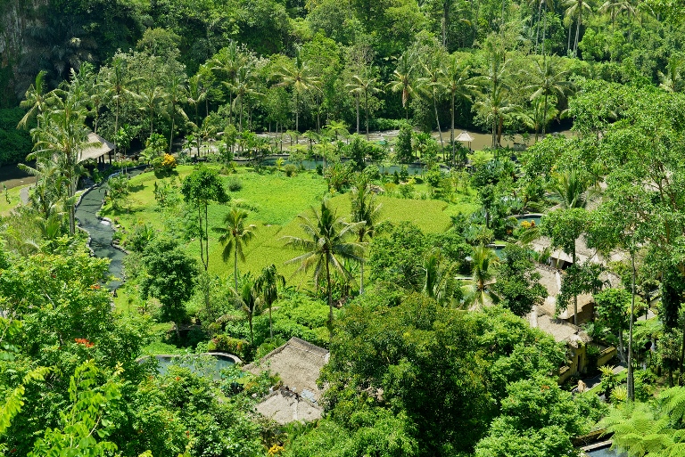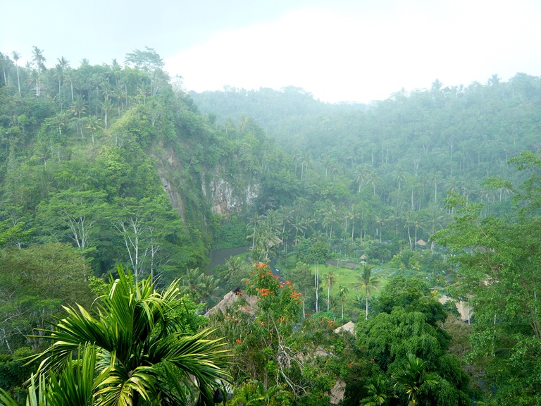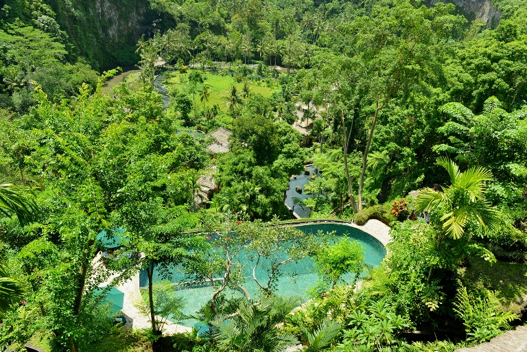ホテルはロビーがある場所が一番高い場所、一番低い場所がアユン川ですが、その中間に位置し森の真ん中で渓谷を見上げるような景観。