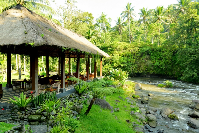 エレベーターで降りて行くのでロビーからは離れていますがアユン川のほとりのアユンオーガニックレストランでの朝食も利用出来る、自然を体感するヴィラ。