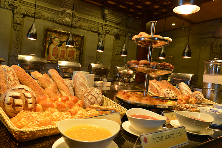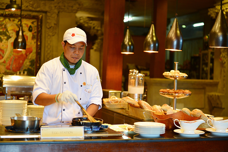 卵を好きなスタイルで調理してくれるエッグステーション、色んな種類のパンやフルーツ数えきれない種類が並びます。空気が美味いが食事も美味い。