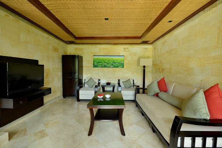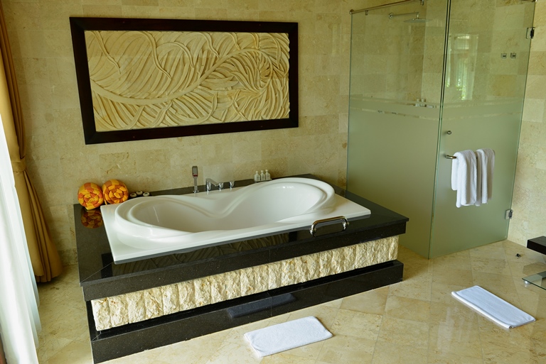 ロビーは、細かく彫られた伝統的な石彫と大理石の床がバリ情緒たっぷり。真っ白な蘭が高貴に揺れます。