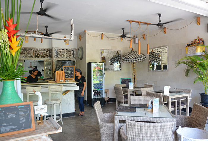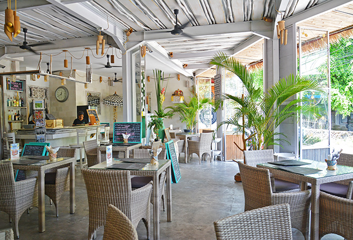 白が基調のレストラン内はよく見るとバリテイストもありで結構ユニークな感じなのですが、全体にはちゃんとお洒落にまとまっています。インテリアのコーディネートはフランス人の奥さまなんでしょうか?