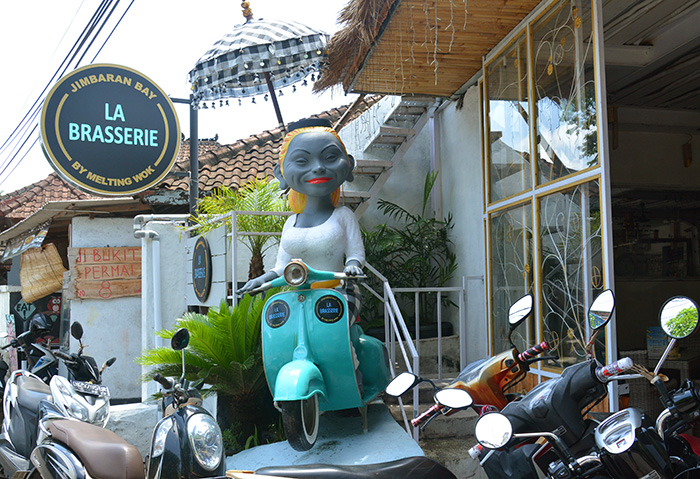 お店の前にはユニークでお茶目なオブジェが。ベスパに乗ってバリの正装衣装を着た白人女性。どこかで見たことあるような(奥さまですよね)。笑