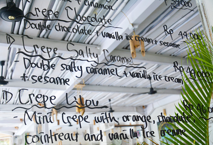 メニューはウブドの「メルティングウォッ」とだいたい同じとのことですが、こちらではウェスタン料理も取り扱っているそうです。日替わり料理や本日のおすすめ料理をスタッフのコが黒板を片手に説明してくれます。