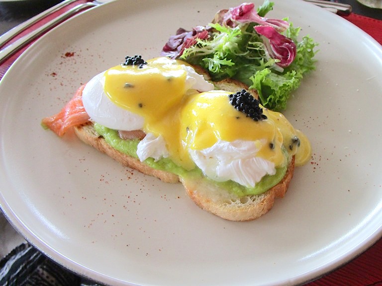 サーモンのエッグベネディクト。ポーチドエッグと共に添えられるのは、アボガド、グリーンサラダ、トリュフオランデーズ、キャビア、サワードゥ。