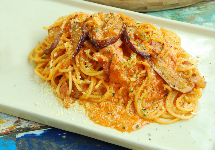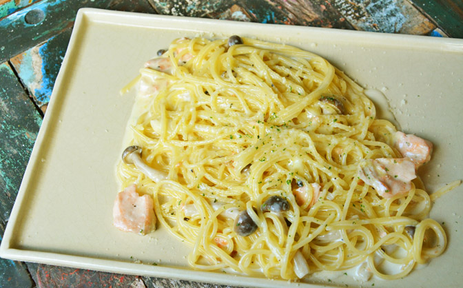↓スパゲティ アラ サルモネRp.63,000。こってりクリームソースの好きな方にはたまらない一品です。きのこはしめじを使っていて、バリではめずらしいです。