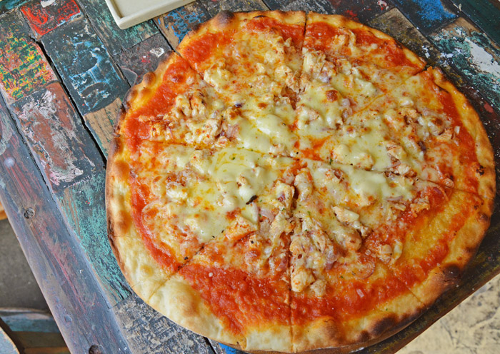 ↓こちらは変わり種のピザです。ピザ アヤム サンバル マタRp.54,000。アヤムは鶏肉のことで、サンバル マタというのはバリの代表的な生サンバルです。レモングラスやチリ、にんにく、シャロットなどを使っています。レモングラスがチーズとすごくよく合ってるんですよ!このミスマッチ、かなりイケてます!