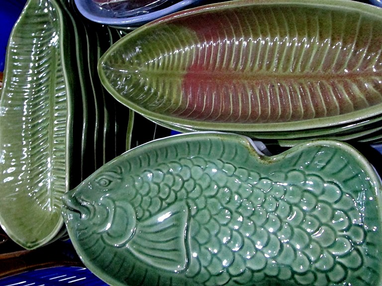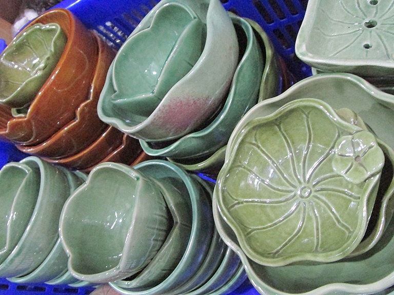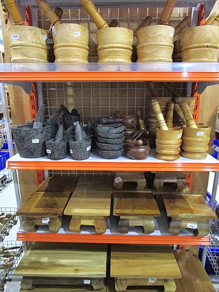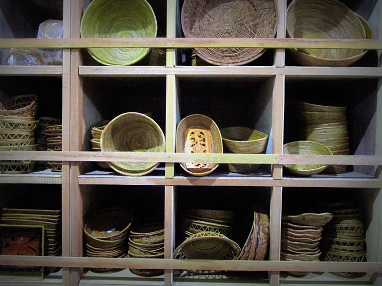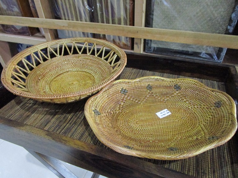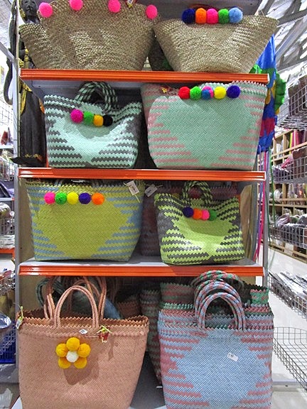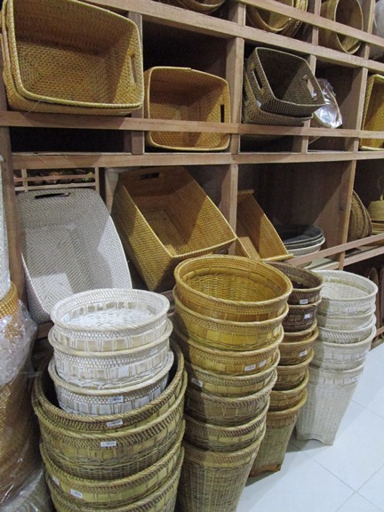ポンポン付カゴとプラスチックのカゴ。軽くてたくさん入る便利カゴはローカル市場で皆が使ってます。一番下右側の水色のカゴは Rp 23,000.
