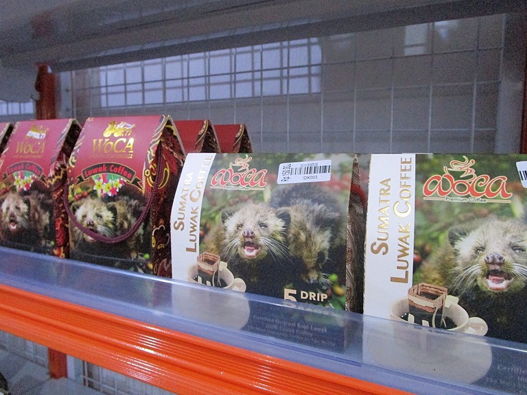 一度飲んでみたい言われる、コーヒールアック。右のタイプでRp 150,000.凄い顔のジャコウネコ…