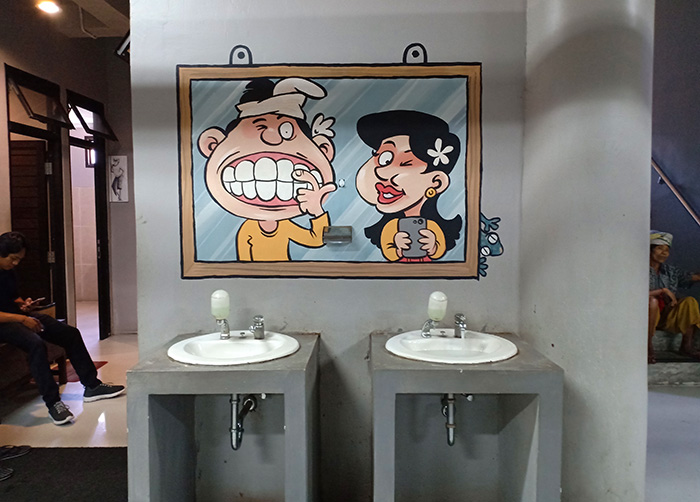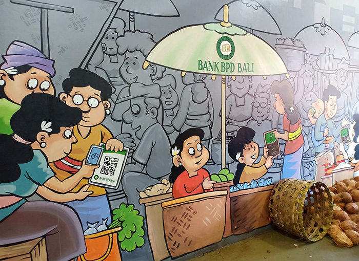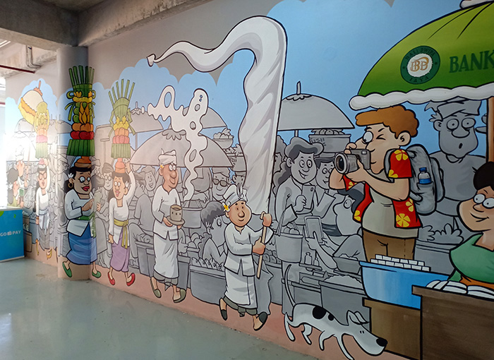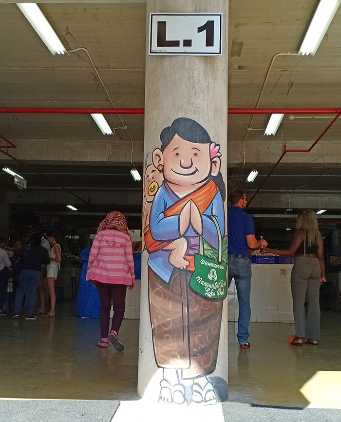 この新しくなったパサール、あちこちにバリの人々の日常をコミカルに描いたものやそのポイントに合った漫画風のイラストがいっぱいあるんです。こういうの楽しくて素敵ですよね〜?