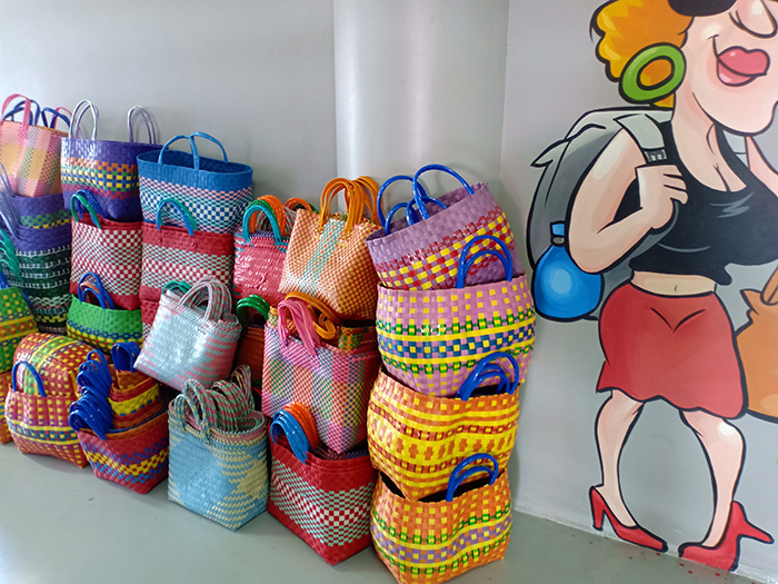 バリ人女性が市場に行く時に持って行くカラフルなビニールテープで編んだかごバッグ。