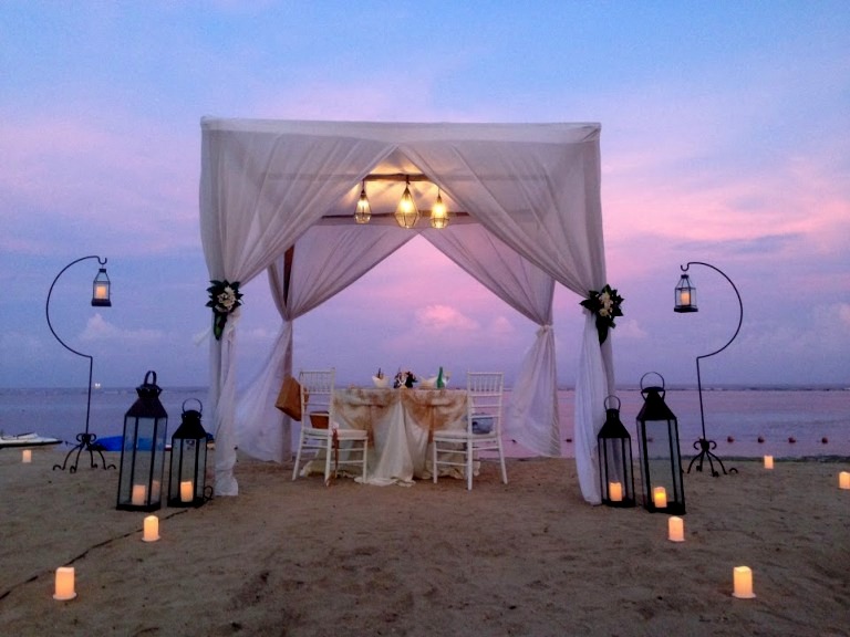 夕焼け~星空の下で4コースディナーを堪能。アップグレードプランの “ロマンティックディナー”は、白砂ビーチにキャンドル。