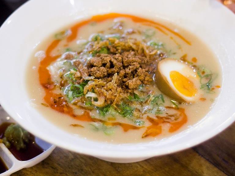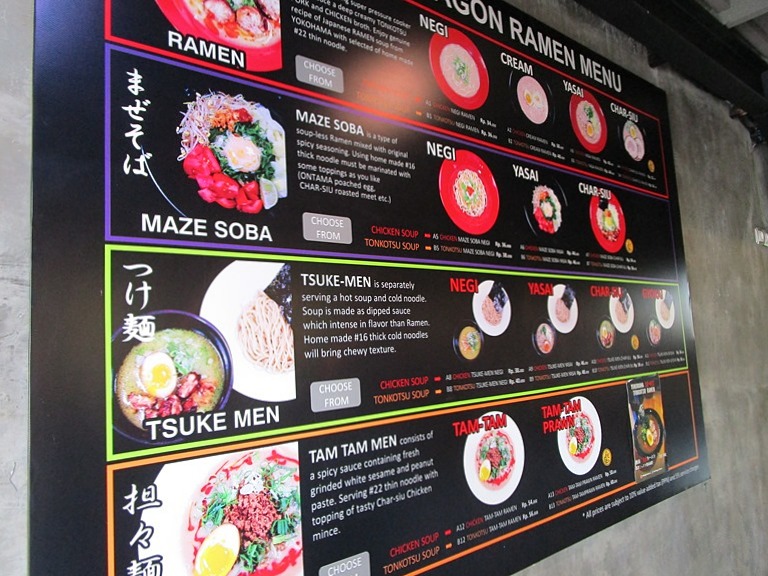 例えば…ラーメン+チャーシュー+豚骨スープRp 54,000、まぜそば+ネギ+鶏 Rp 36,000、つけ麺+魚介+鶏スープ Rp 56,000、担々麺+海老+豚骨スープ Rp 60,000、です。