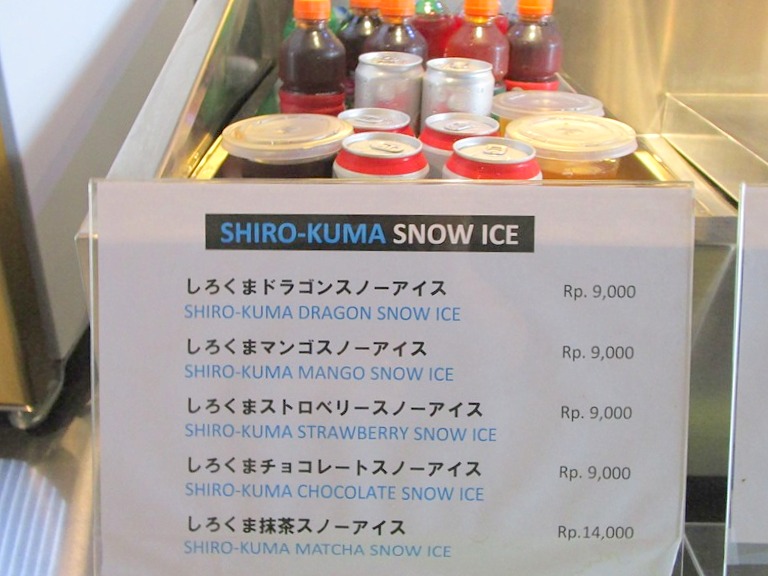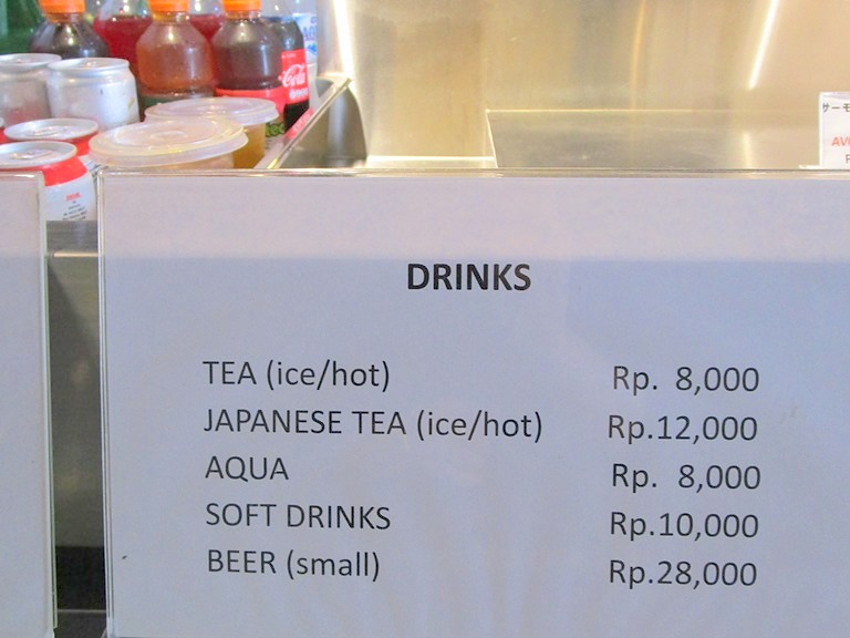 そのカウンターにはディナータイムにオープンするトッピングビュッフェコーナーがあり、かき揚げ Rp 6000、餃子 Rp 8,000、鶏串カツ Rp 8,000、鶏から揚げ Rp 8,000、豚チャーシュー Rp 16,000、鶏チャーシュー Rp 12,000、タコボール…etc等、寿司ビュッフェにはアボカドドラゴンロール Rp 12,000、カリフォルニアロール Rp 12,000、炙りサーモンロール Rp 20,000、あと枝豆等がありラーメンと一緒にちょこちょこと頂きたくなるものばかり!が並びます。
