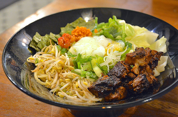 ↓豚骨スープのまぜそば Rp.56,000。チャーシューの端っこはかなり濃厚なお味、野菜や温玉、チリなど、たくさんの具が乗っていますが、一気にかき混ぜて頂きます。しっかりした味付けで麺は太麺を使用。ダイナミックにどうぞ〜!